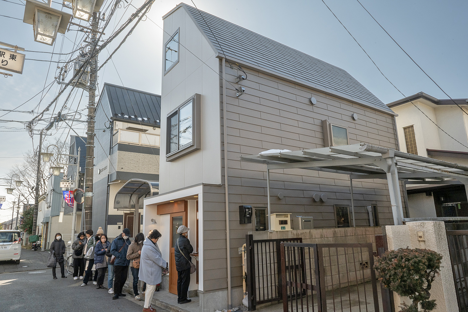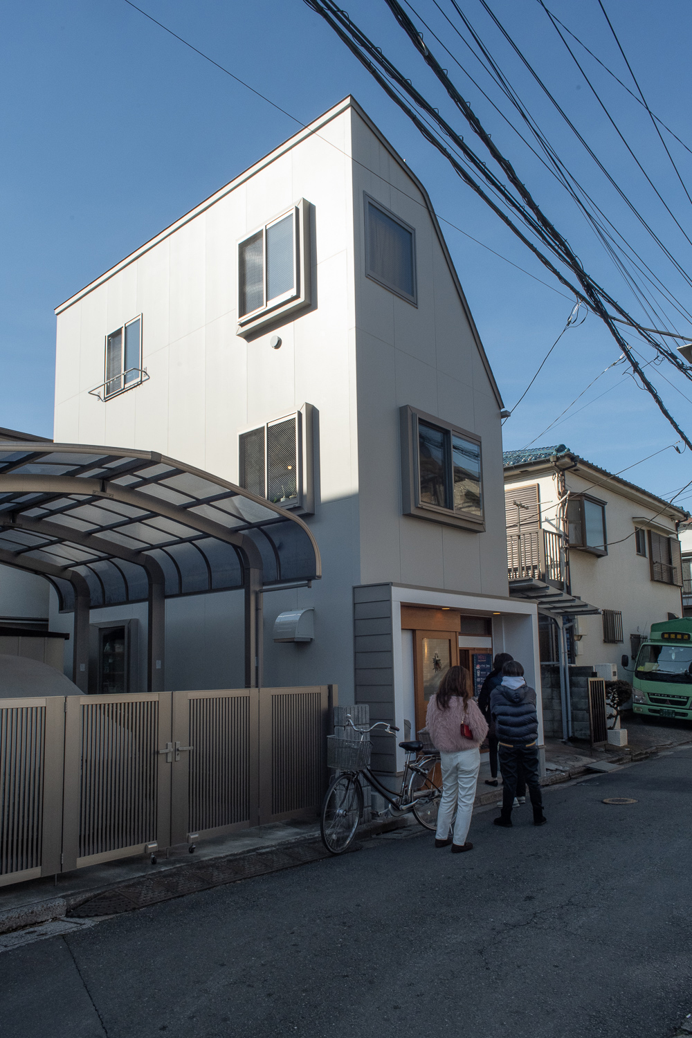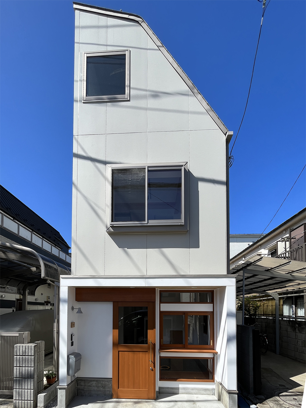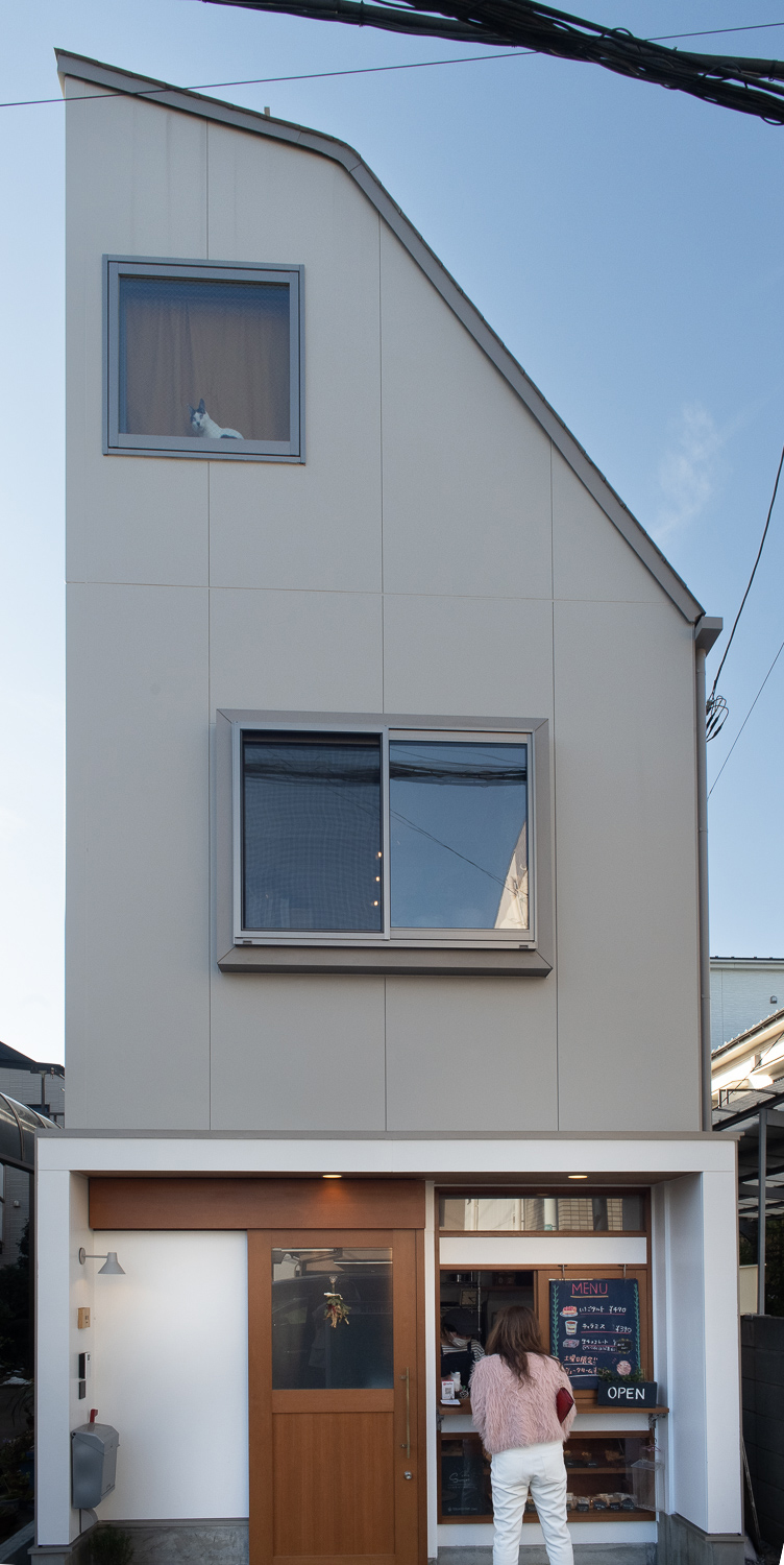 小平市の住宅地に建つ小さな店舗併用住宅です。 第2種高度地区のエリアなので、斜線制限で形態が規制されています。