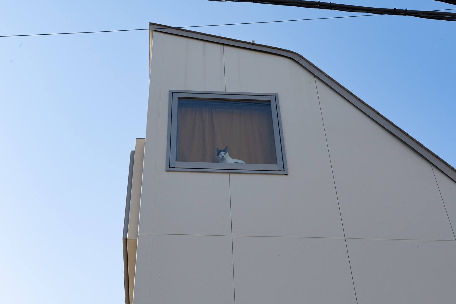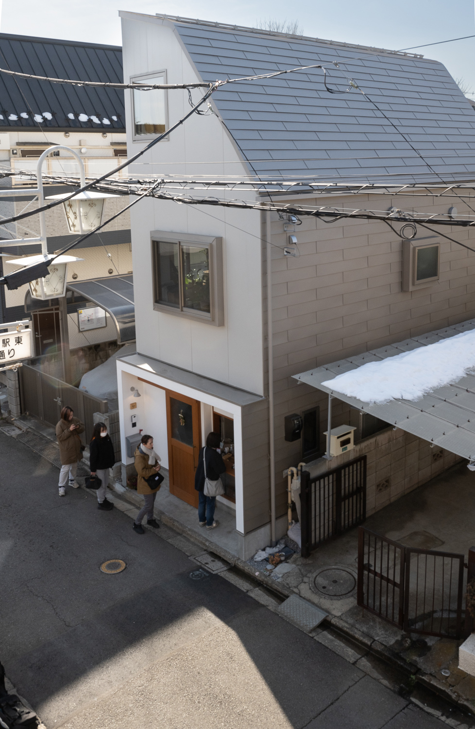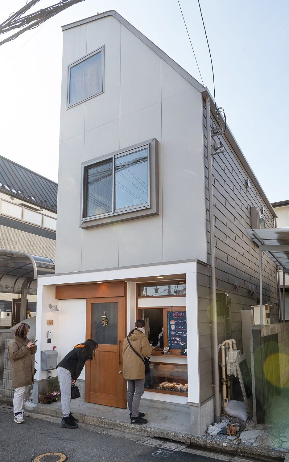 小平市の住宅地に建つ小さな店舗併用住宅です。 第2種高度地区のエリアなので、斜線制限で形態が規制されています。