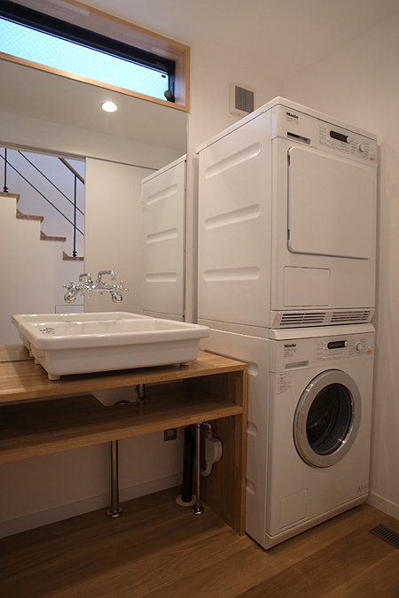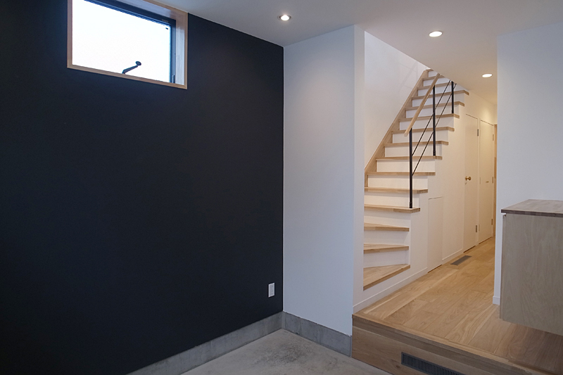 限りある狭小の敷地の中、仕切りがなく、高低差のある天井の2階LDKや、吹抜けに設けた高窓、蹴込板のない鉄骨階段などで、広がりのある明るいLDKとなりました。
