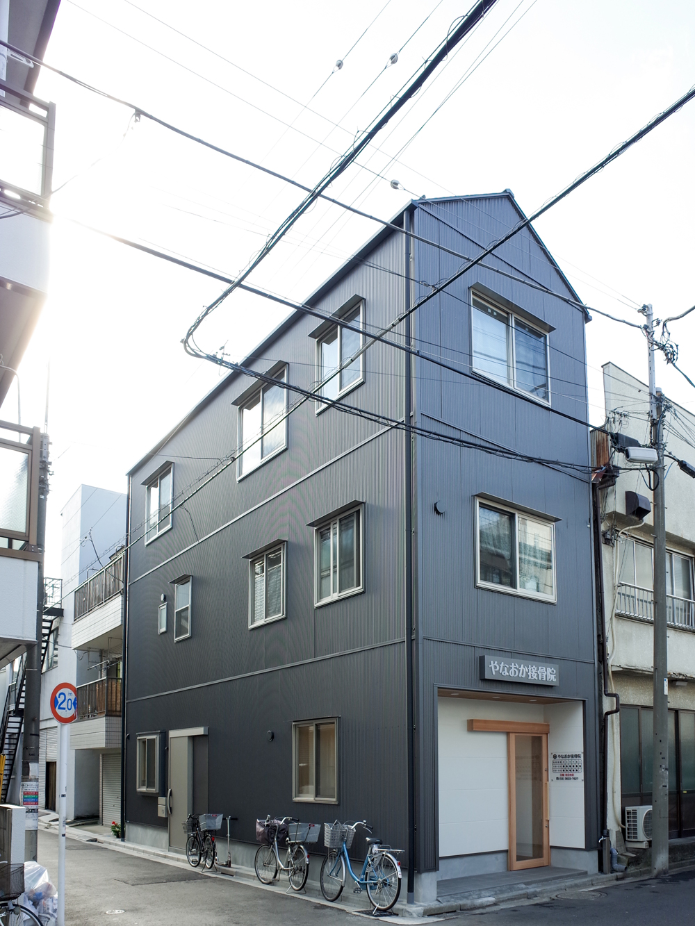 したまちの狭小地に建つ店舗併用住宅です。防火地域の3階建てのため木造耐火構造です。したまちらしく、小さな敷地ですが2世帯3世代がすむ店舗併用住宅です。1階が整骨院、2,3階が住宅の用途となっています。