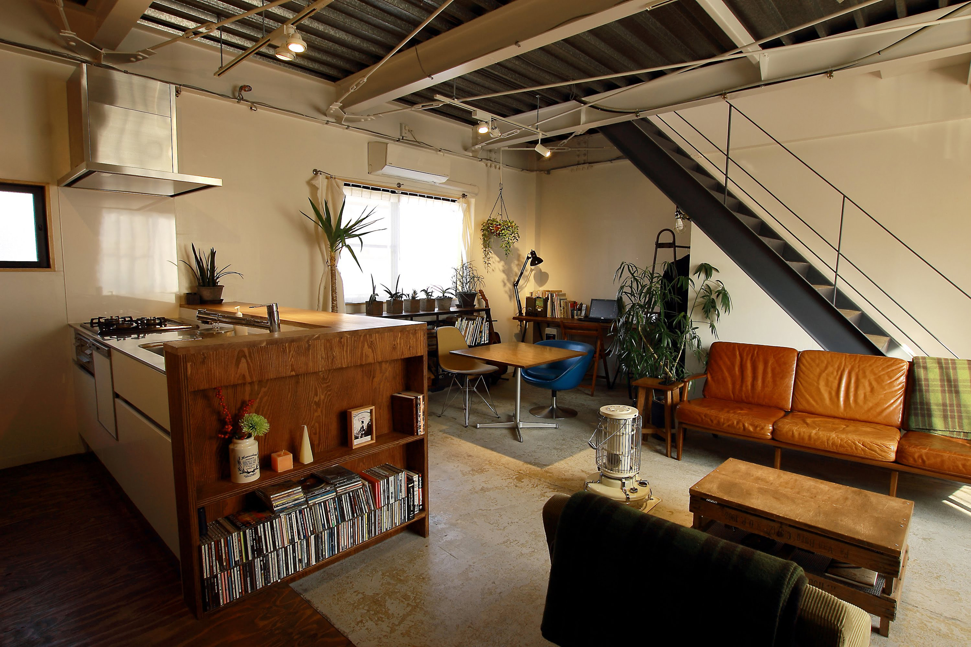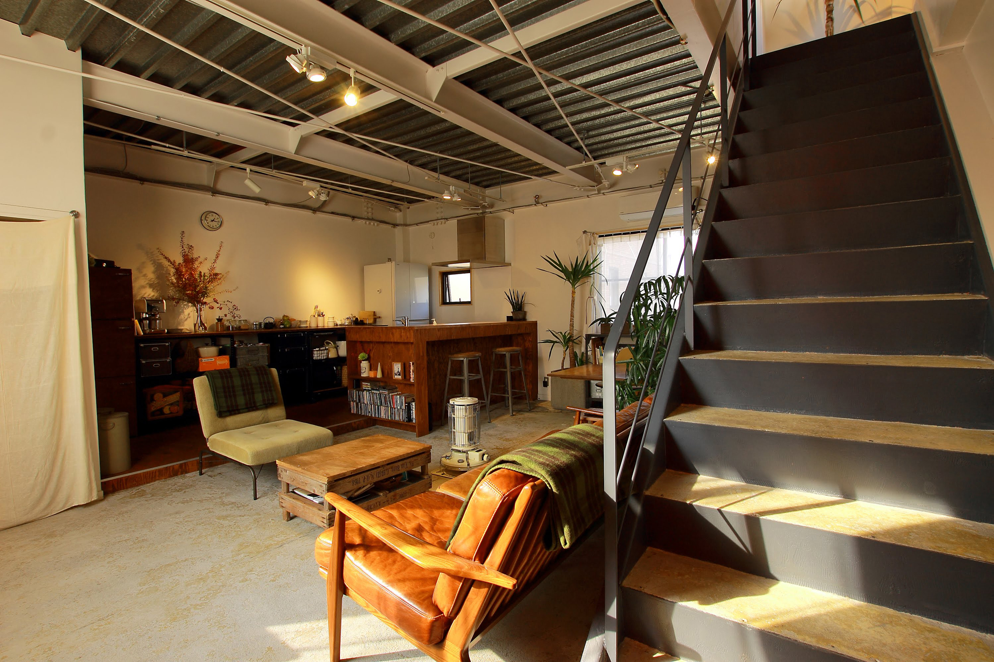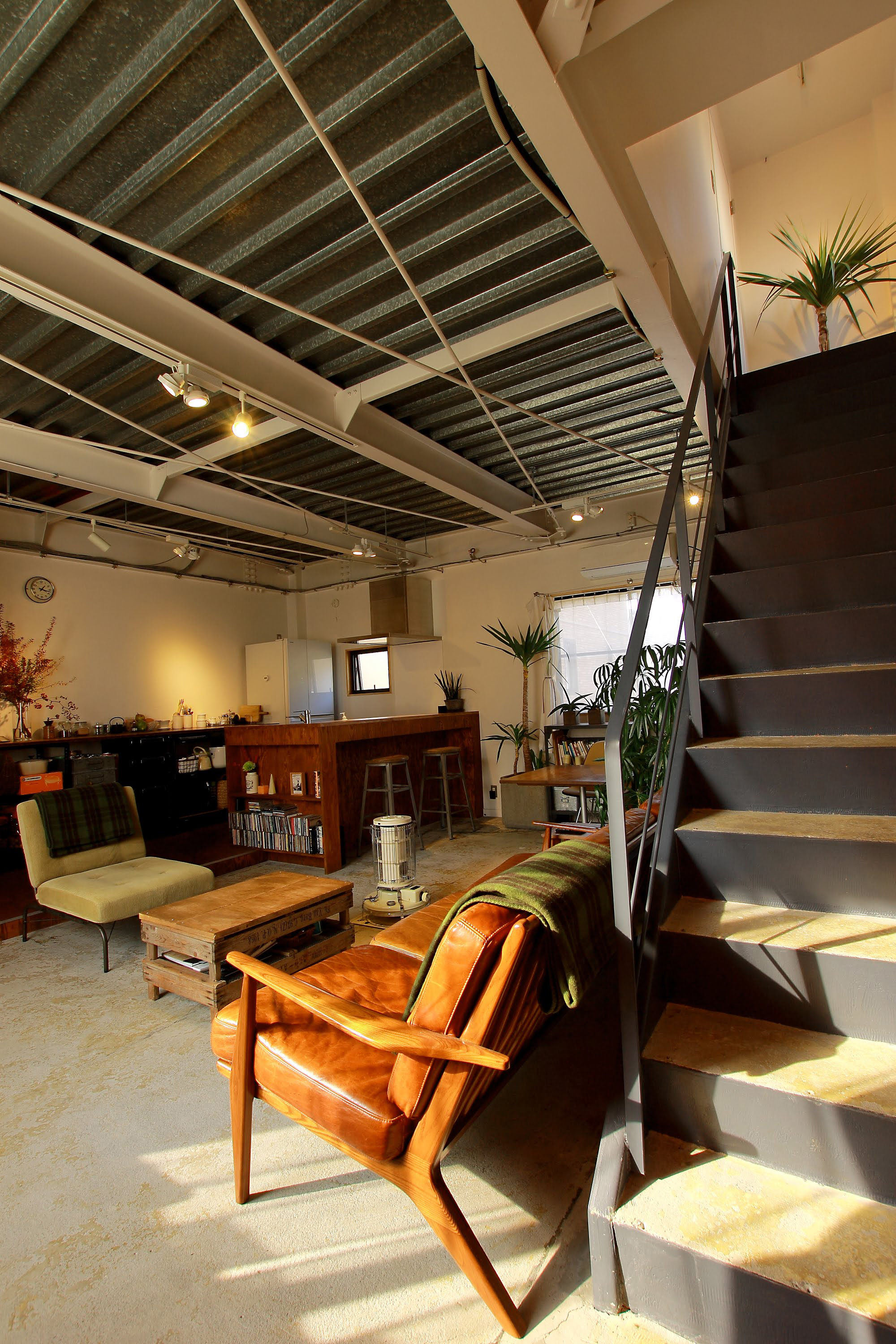 2階スナックは窓が1つで薄暗く、仕切り壁により窮屈な状態でしたが、南北2面接道の立地を活かし、開口部を新規に設け、天井や壁を解体することで、開放的で風通しのよいLDKとなりました。スケルトンの天井、シートを剥がしただけのコンクリート土間、区画壁を解体して露出した階段など、削りだす設計とすることで、既存のソースをいかした中古ならではのテイストが感じられる空間です。