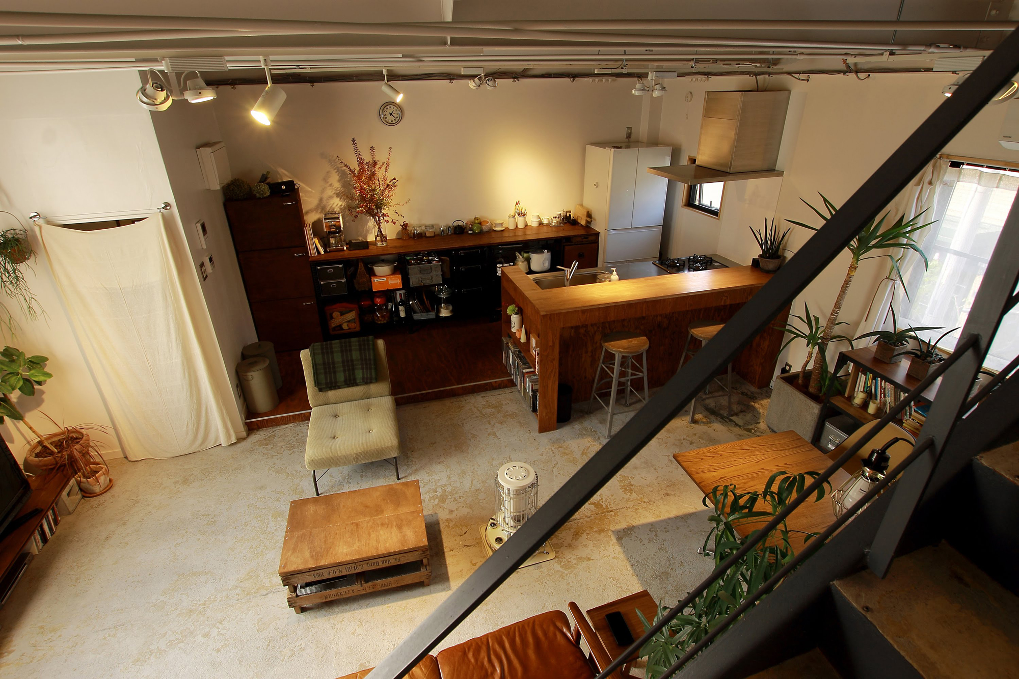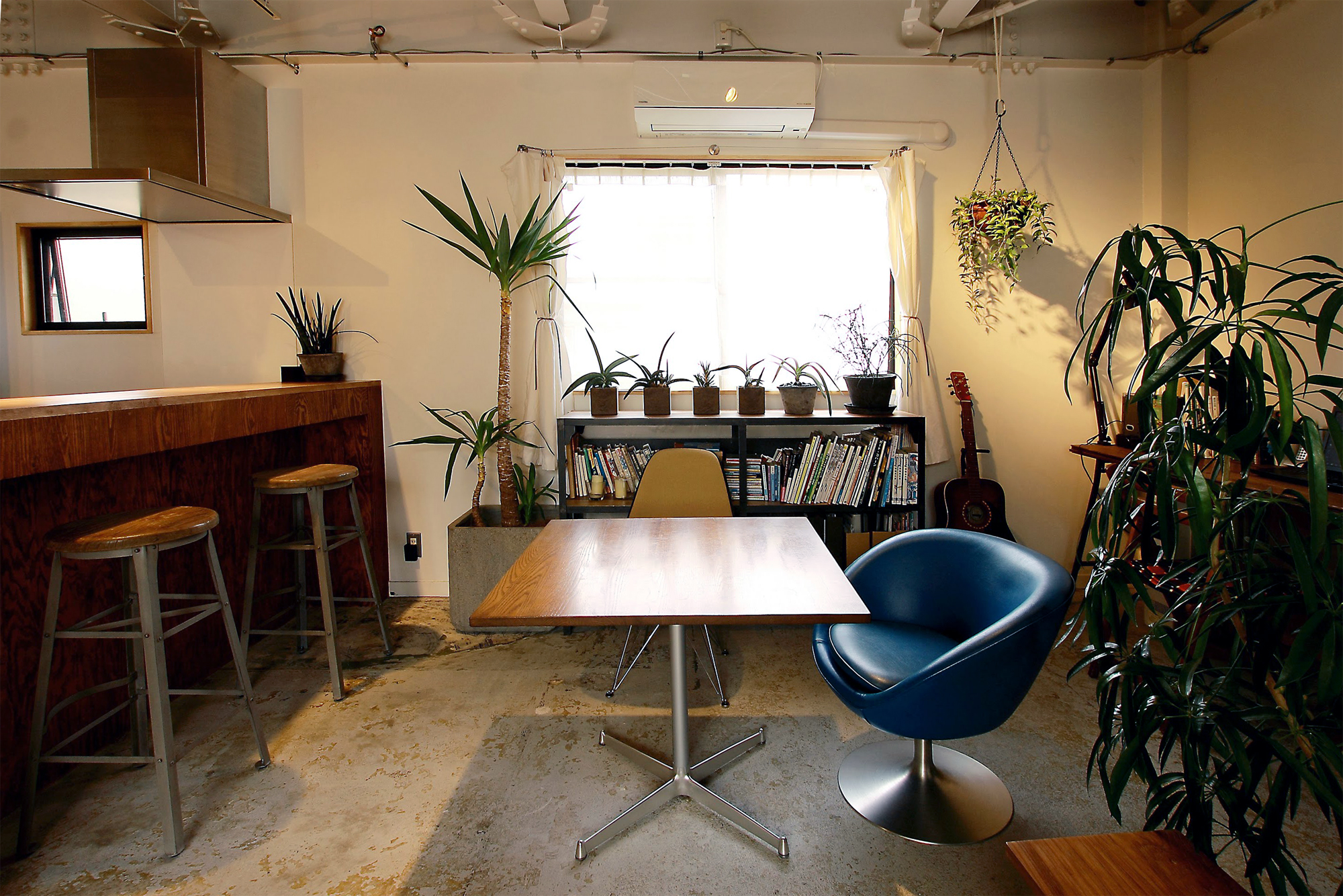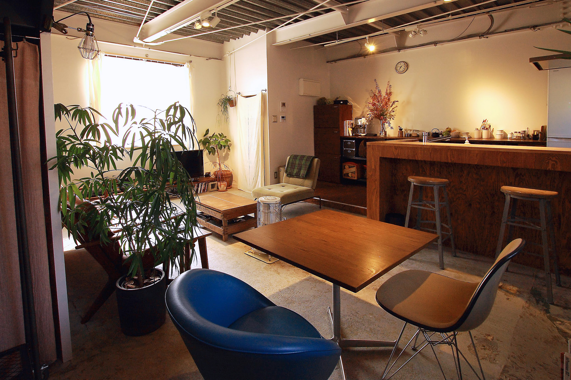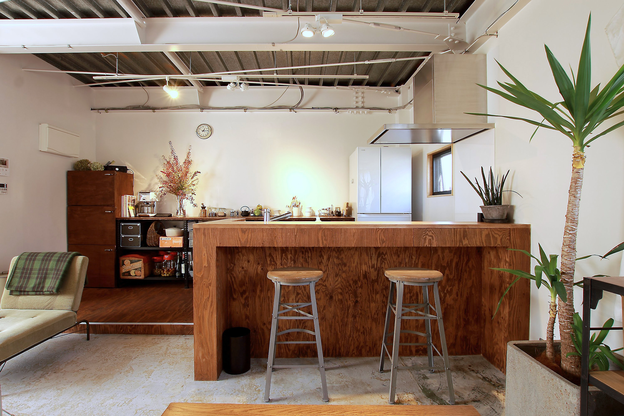 2階スナックは窓が1つで薄暗く、仕切り壁により窮屈な状態でしたが、南北2面接道の立地を活かし、開口部を新規に設け、天井や壁を解体することで、開放的で風通しのよいLDKとなりました。スケルトンの天井、シートを剥がしただけのコンクリート土間、区画壁を解体して露出した階段など、削りだす設計とすることで、既存のソースをいかした中古ならではのテイストが感じられる空間です。