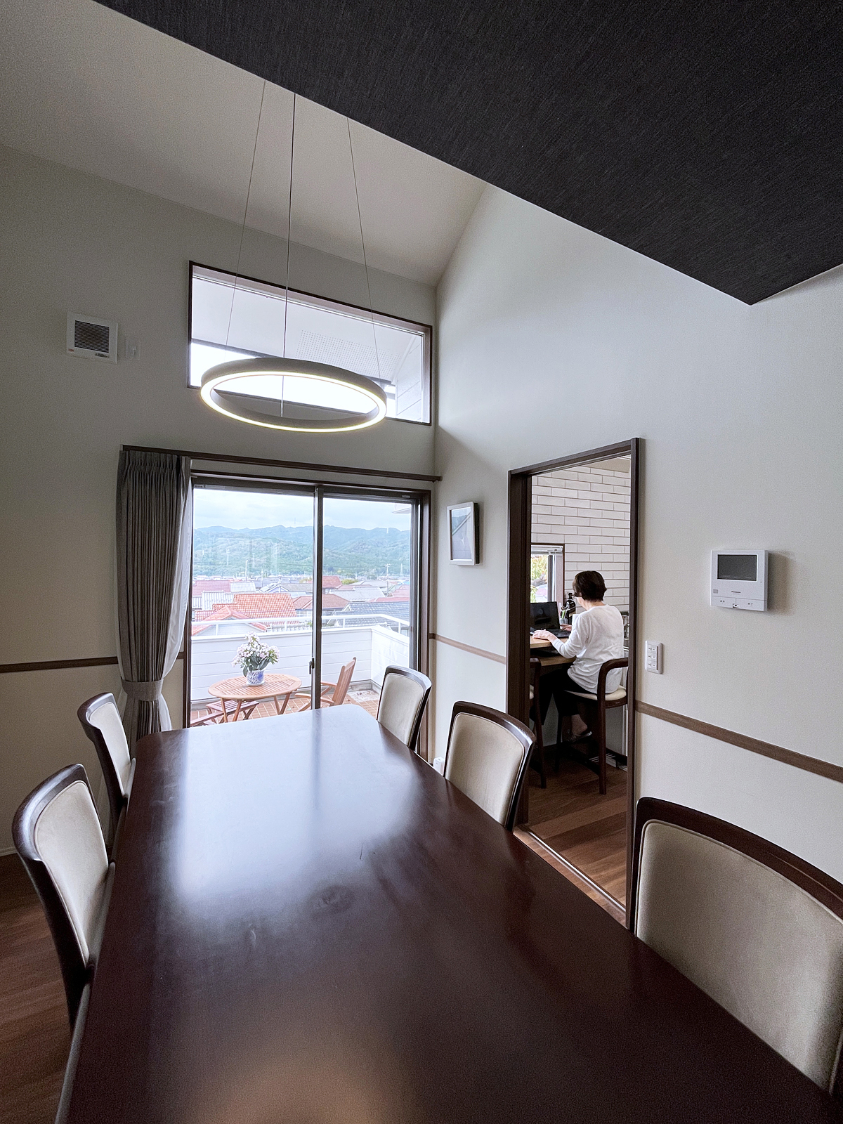 ・リビングからダイニングを見る。高台なので北側の窓越しに周辺の屋根が見える