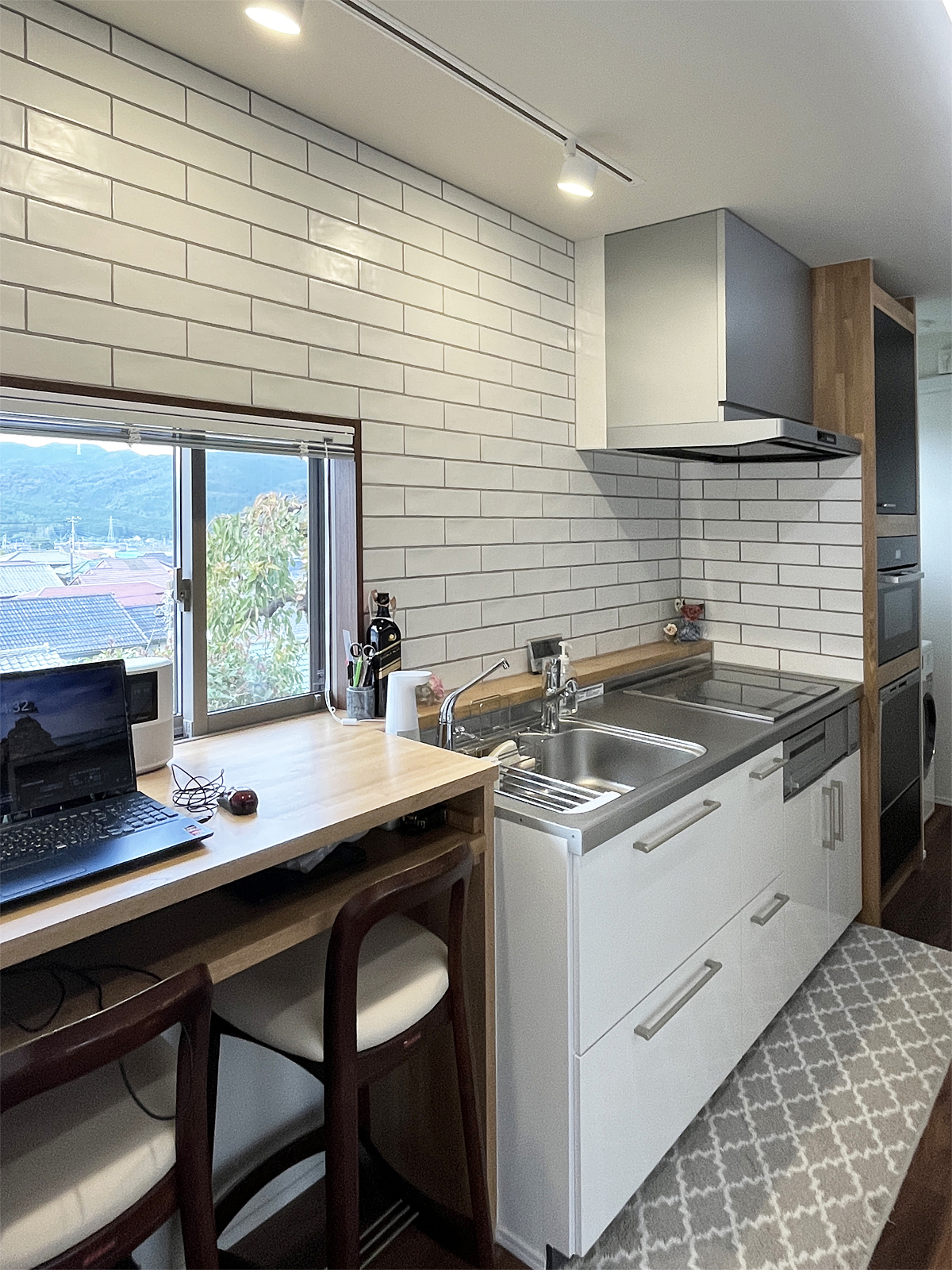 ・コンパクトなワークスペースとキッチン。見晴らしが良い。